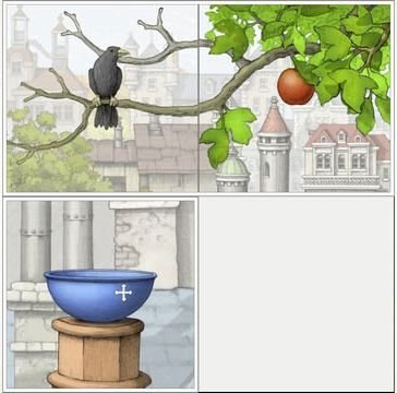 这一关的通关方法就是把左上角的乌鸦给踢下来,然后把右上角的苹果弄到碗里。接风连接起来,就触发了。之后引导孩子往前走,调整一下整个门洞的位置,让他进入到花园里面。