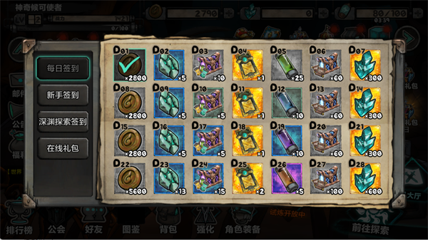 每日必签,领取金币、材料、道具等资源,新手签到还可获得额外福利,助力前期起步。