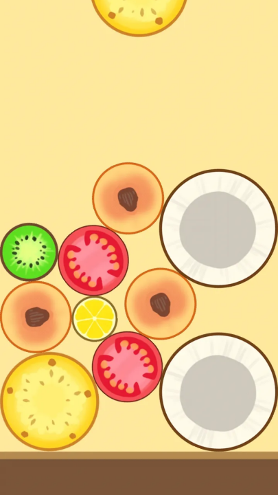 2、将相同品种的水果进行碰撞合成,每次合成都会生成全新的水果,并获得相应的分数加成。等级越高的物品获得的分数奖励也越多。