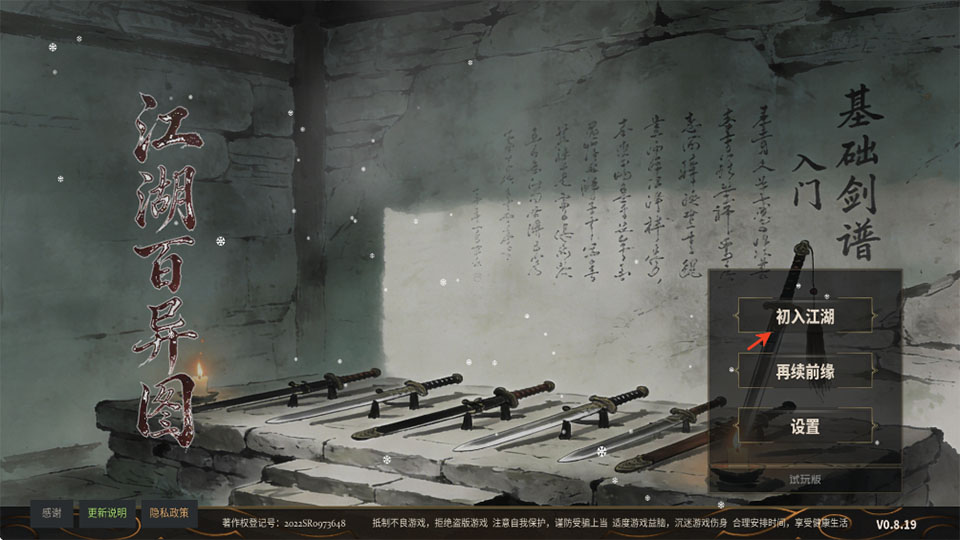 1、进入江湖百异图游戏内点击"初入江湖"开始游玩。