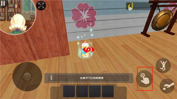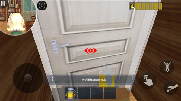 5、左上角显示的是菊子的界面,玩家需要时刻注意她的举动,不要被她捉住,当小圆点显示红色时,玩家可以点击手指按钮,打开铁门,另外两个按钮分别的跳跃和投掷;