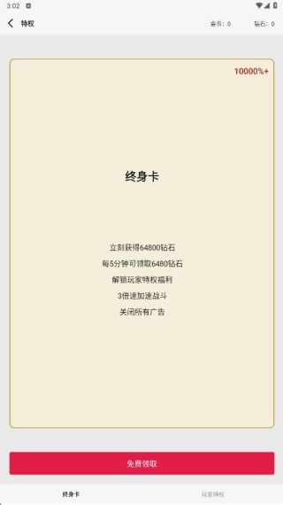 2、点击特权,获得终身卡,可以免费领取无限金币;