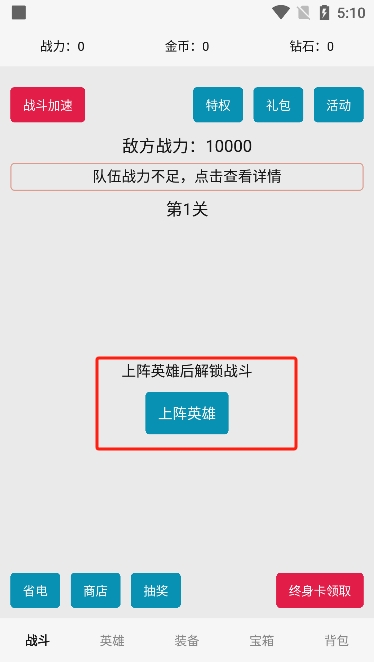 2、我们需要上阵英雄,这时候我们点击上阵