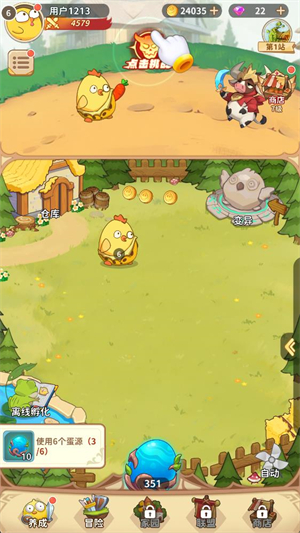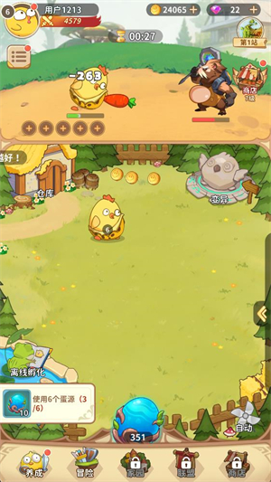 3、点击上方的冒险按钮可以派遣小鸡去闯关,小鸡会自动攻击敌人来完成挑战。