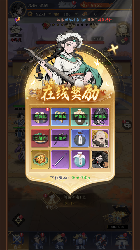 4、同时,游戏界面还有在线时长等活动,不要忘记领取;