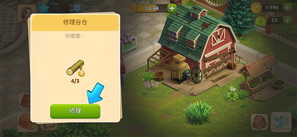 5、农场中的很多设施需要修理后才能用,例如谷仓,修理前需要拥有足够的材料菜可以修复哦