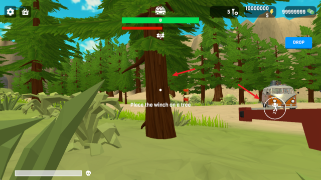 2、在房车头有着绳索,长按即可拉动,将其绑在树木上。