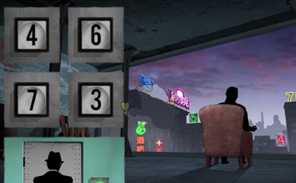 这章中主要是有个电梯,玩家上电梯后,有个密码锁需要解除,线索是右侧背景的霓虹灯,可以根据数字的闪烁顺序来判断密码为4673