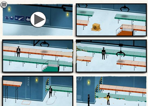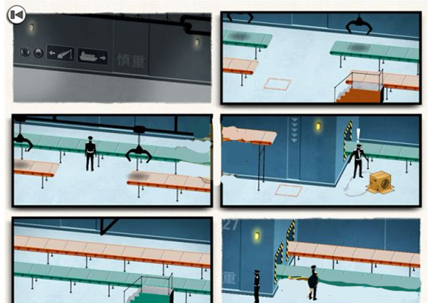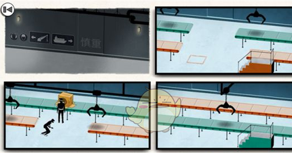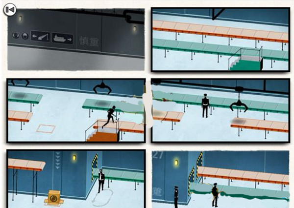 这章是最难的,玩家需要通过纸箱掩护自己通过传送带来过关,其中需要多次调整画面,其关键点是让箱子上到红色传送带,人物上绿色传送带,这样箱子就会在画面五落下,而人物从警察背后的绿色传送带出来