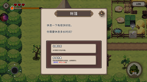 4、下方的帐篷是角色休息区域,可以恢复角色的HP值和耐力值,完全恢复需要消耗一定材料。