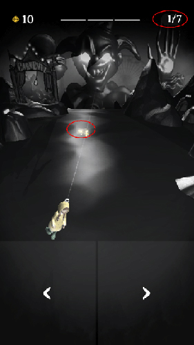 进入游戏,就是昏暗的3D界面场景,中间悬挂这一个陶瓷人偶,其中封印这这个小女孩的灵魂,这里是她的小丑噩梦,她深陷于这个噩梦,但灵魂已经被禁锢,想要逃离。我们能做的就是点击左或右,让其摇摆躲避沿途的山岩、尖刺与敌人,最后逃离噩梦。