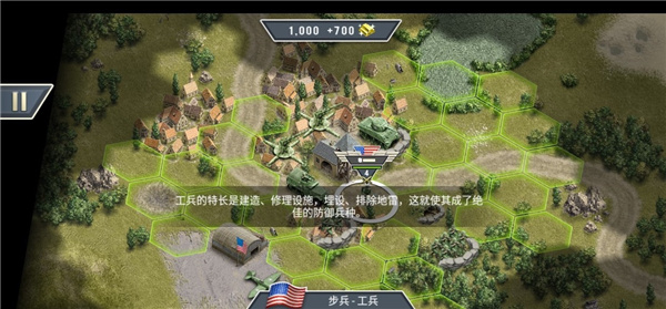 1944燃烧的桥梁(Burning Bridges)是一款以第二次世界大战为游戏背景的策略战争游戏。进入游戏玩家可以选择加入盟军或者轴心国,或者是在正式站边之前先来进行一个系统的新手教程学习,不管你最后要选择哪个军队你都要学会战斗策略,才能够打胜仗。首先是普通的基本训练,学会布置战场上的作战单位,长按任意作战单位会显示它的攻击范围,单击则可以看到燃料、弹药以及该作战单位的详细信息;每一次移动作战单位都会消耗行动值,只要有剩余的行动值你就可以一直反复的进行移动。当玩家摧毁了敌方的作战单位可以获得少量黄金,黄金可以治疗本军队手上的兵种或者购买新的作战单位。