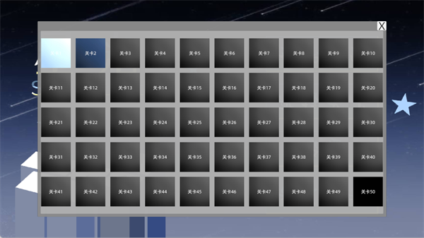 游戏目前共设有50个关卡,已通关的关卡会显示对应标识,而未通关的关卡则呈现灰色锁定状态。你可以随时选择已解锁的关卡进行重玩,或者继续挑战新的关卡。