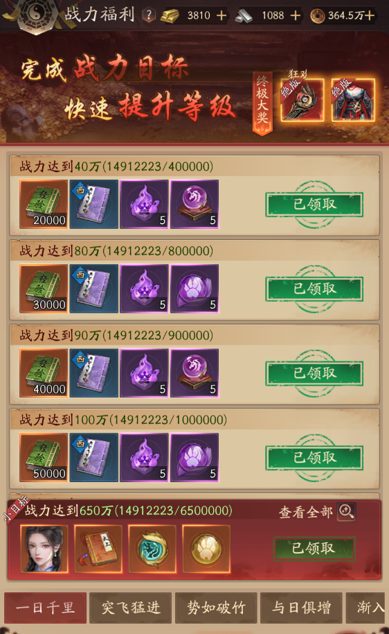- 要点:元宝买次数,集中养成主C,快速达标。