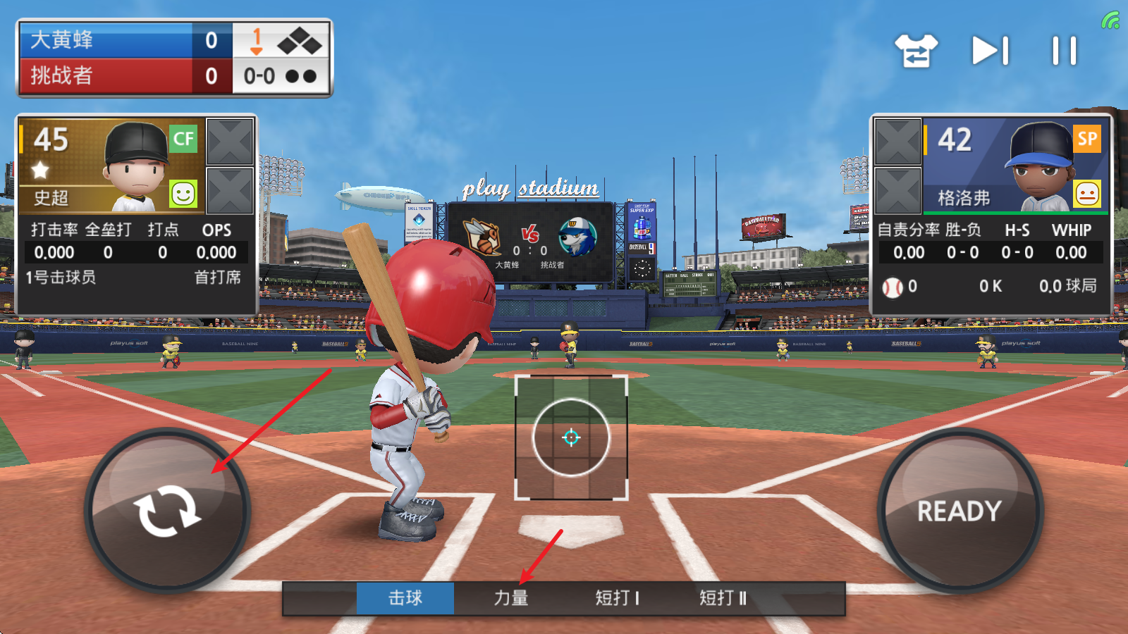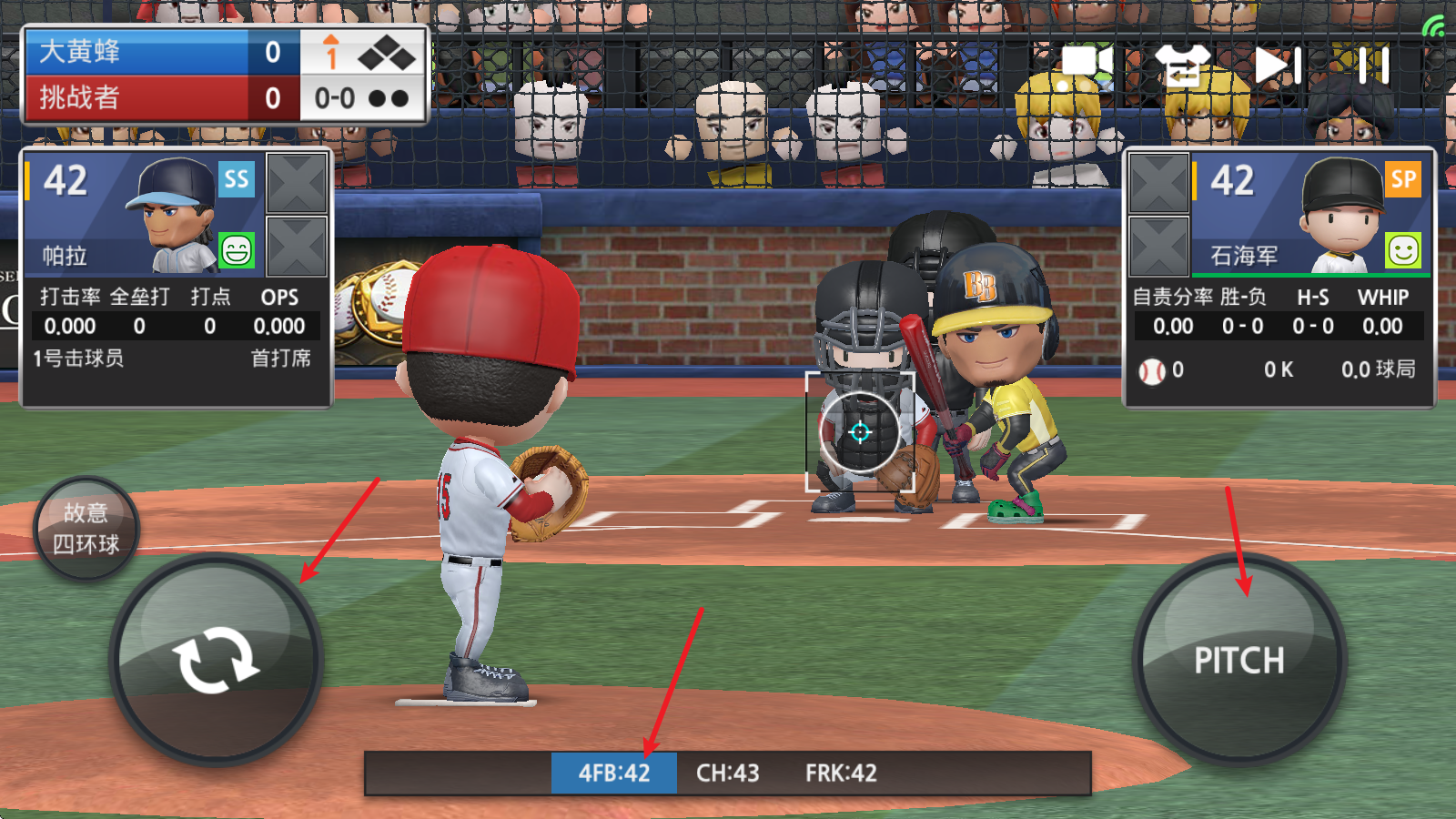 1、棒球分为投球和击球两个环节,首先是投球,我们可以点击左侧按钮来切换不同类型的球,点击右侧投出。