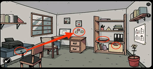 12、切换至卡丽莎来到二楼用红钥匙打开书房,先拿走书架上的A4纸和钥匙冰块,再根据抽屉以及电脑旁边的便签打开电脑。注:便签和抽屉里的便签提示会有所变化,根据实际情况调整即可。