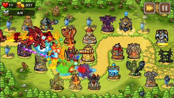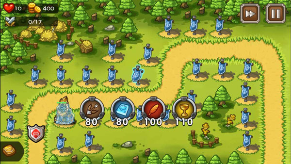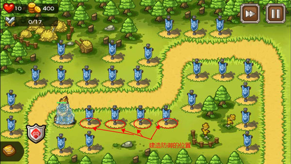 在地图的左上角显示的是你的生命值、金币余额以及敌人的进攻波数,而右上角是游戏加速和暂停键,通过点击旗帜就能选择你要建造的防御塔类型性,四种不同风格的防御建设是玩家游戏中的必要关注点。