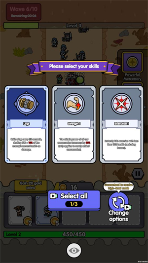 3、召唤不同的小兵需要的金币数量是不一样的,当击败敌人后会获得经验,提升等级后可以选择一个技能来强化小兵。