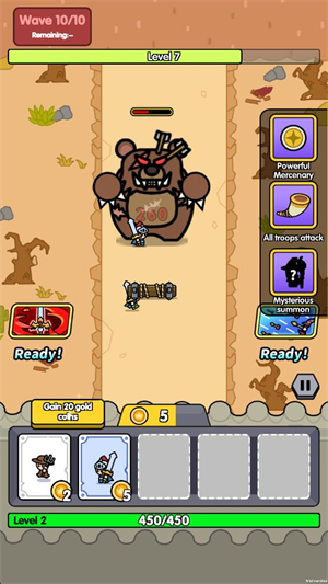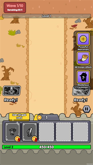2、进入关卡后玩家需要召唤小兵来对抗敌人,你会逐渐获得金币用来召唤小兵。