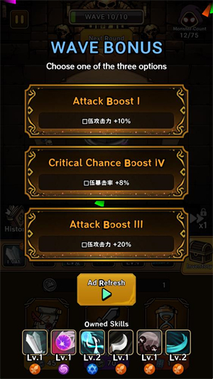 4、当通过一定波次会获得额外奖励,玩家可以选择不同的强化来提升角色的能力。