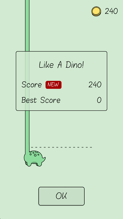 2、左右滑动控制小恐龙接住上方掉落的长条,接住越多,小恐龙的脖子越长,同时分数也越高;