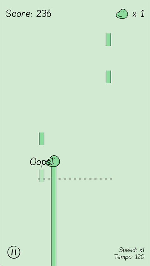 5、当有3个长条溜走后则游戏结束,每次游戏将会记录你的分数;