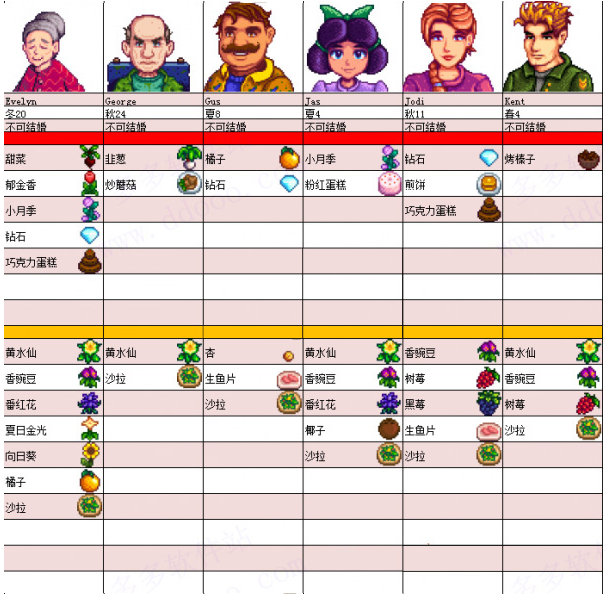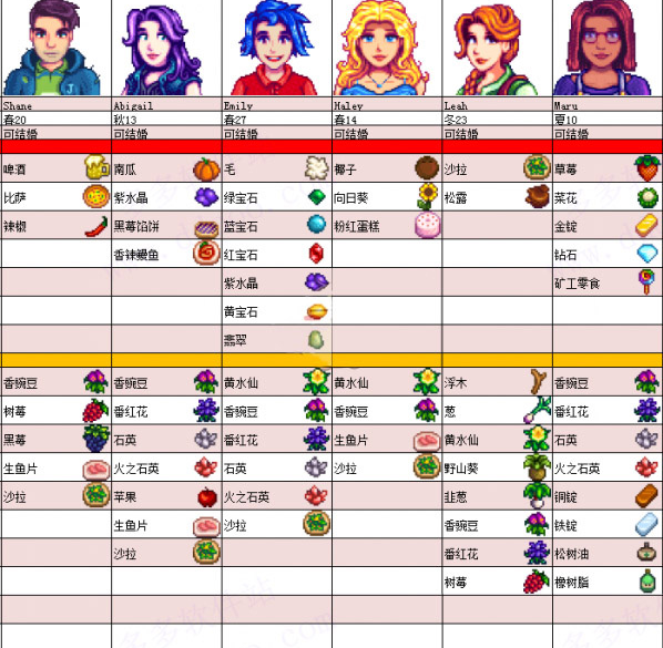 4、阿比盖尔:是一个叛逆性的女孩,最喜欢器材碎片、兔子的脚、黑莓馅饼、巧克力蛋糕、河豚、紫水晶、南瓜,喜欢所有宝石、料理、工业品、花、不喜欢所有的鱼、手工艺品、矿产、建筑材料等,讨厌所有的蛋、垃圾、鱼饵、牙签、海藻等。
