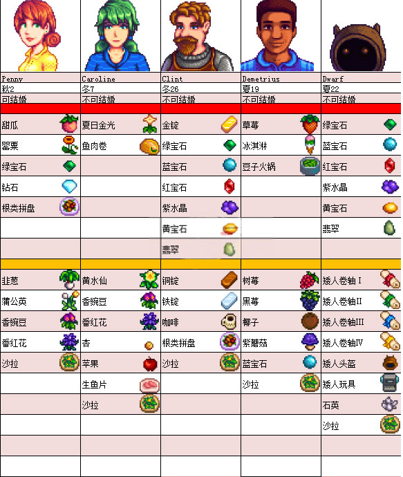 1、压力克斯,是攻略性的第一位男性NPC,爱好运动,他最喜欢吃荷包蛋、牛奶、土豆煎饼、鲑鱼拼盘,最喜欢鸡蛋、鸭蛋、宝石、料理。工业品、蔬菜、花、枫糖浆、水果,不喜欢手工艺品、讨厌垃圾、野草、罂粟、牙签、石头等。