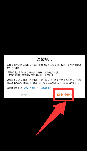 1、点击温馨提示里的同意并继续。