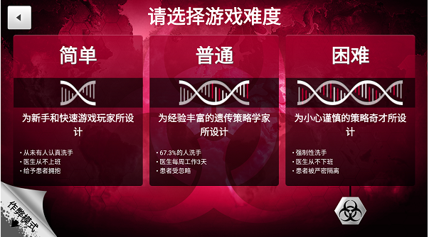 在普通模式中,难度就会相对的提升一些,在全球的人类中会有67.3%的人会洗手从而导致病毒的传播概率下降,而且医生每一周都会有3天的上班时间,这也导致了解药将会开始研发,虽然研发时间相对的会非常的久,但是当研发成功,那么玩家就会需要拥有抵抗解药的抵抗力不然就会失败了,当发现感染患者也不会太过于重视。 而在解药模式中,各国开始互相猜忌,政府官员会出现懒散的情况,而且医疗设备会出现缺乏的情况。