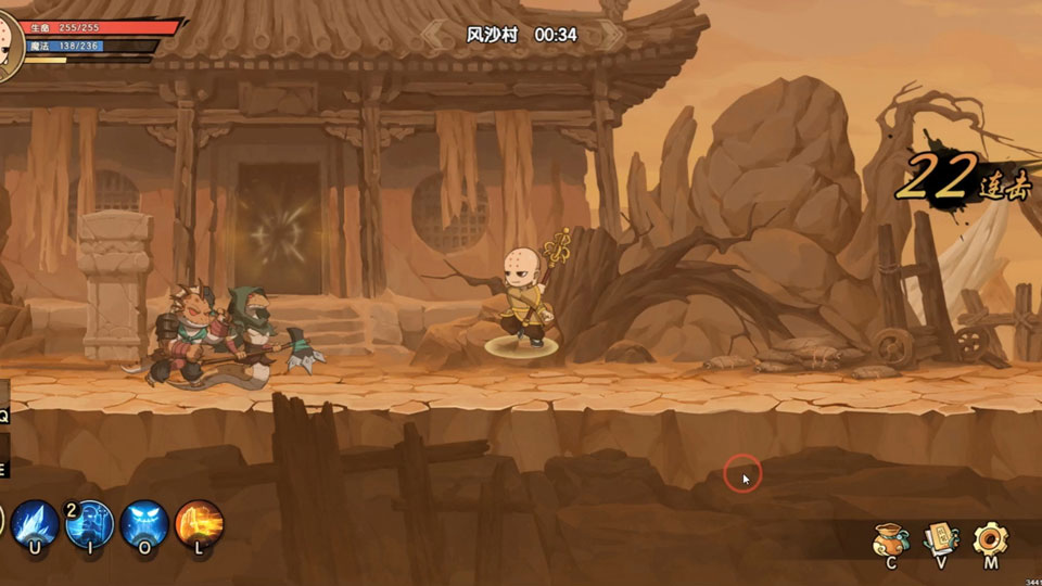 2、进入到风沙村以后,玩家首先会遇到3个小怪,这4个小鬼击杀起来非常的简单,只要使用普通攻击简单几棒子下去就能够轻松的击败小鬼,第一波小怪全都击杀以后,会出现几秒钟的空挡时间,在这个事件中玩家的生命值会自动补满,等生命值布满以后第二轮小怪就会出现,这一轮出现的小怪数量变成了6个,击杀起来也没有什么难度问题,这里就不过多的讲该怎么击杀了。
