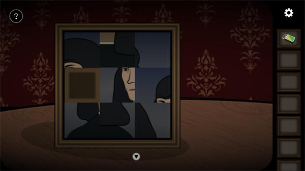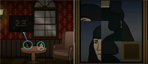 来到窗边拿走茶几上的玻璃杯和威士忌酒瓶,然后点击旁边的相框完成上面的拼图,接着再观察人物嘴中的提示(符号对应的数字:<l>2 Ψ3)。