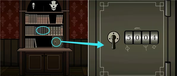 到书架那里先根据海报上的六个符号调整对应的书籍使其顺序一致,完成后可获得火柴,接着再根据下面保险箱上的符号提示获取密码2139,打开后拿走里面的钥匙和酒精灯。