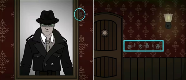 将骷髅头摆放在柜子的最上层,然后根据门口的提示(骷髅头点击顺序)按②①②;③①③的顺序点击骷髅头获得眼球,接着到右边用匕首划开沙发获得第三块符号方块。