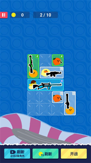 2、进入关卡后需要将初始角色放在对应的格子里,相同的角色可以合并提升等级。