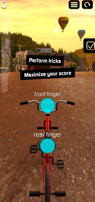 4、然后就可以正式的进入游戏了,我们需要用两根手指分别控制单车的前轮和后轮,以此来表演各种特技。