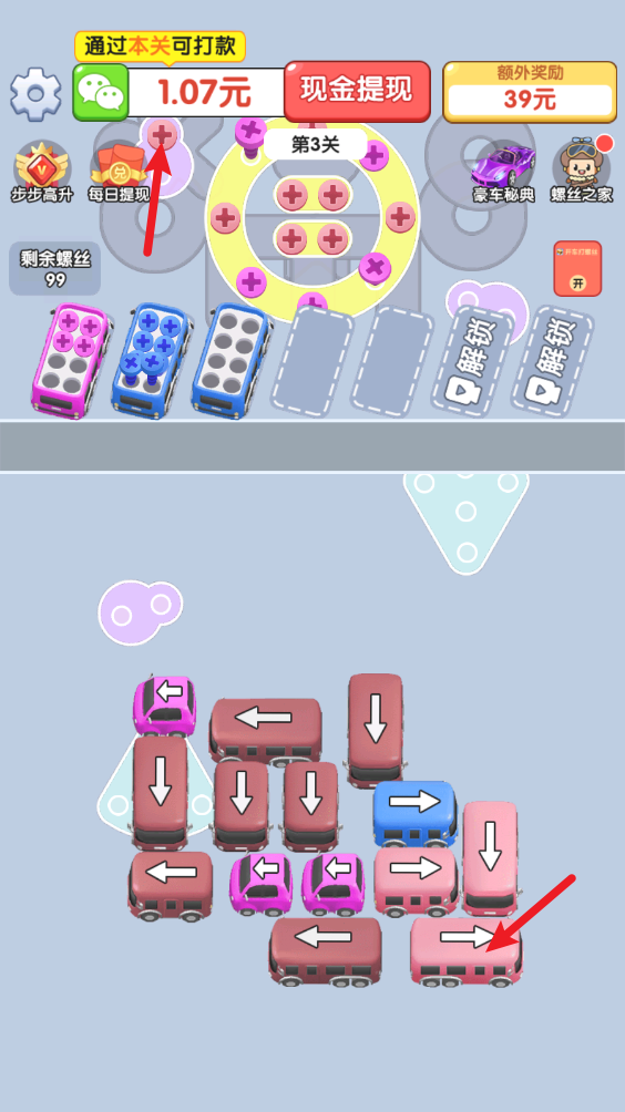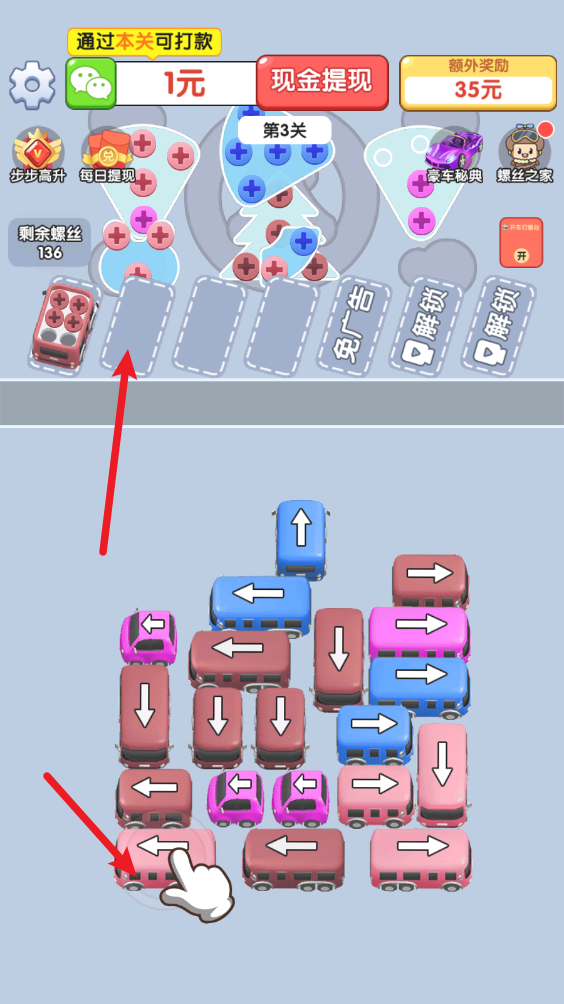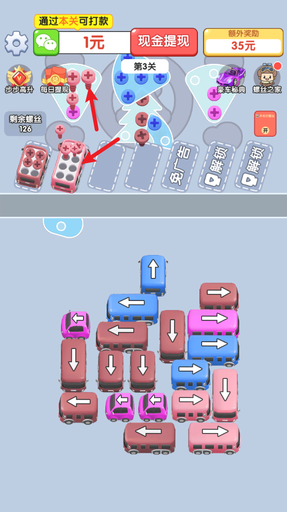 开车打螺丝红包游戏融合了停车位和解螺丝两种经典玩法的趣味休闲游戏。游戏中我们需要将不同颜色的小车开到停车位当中,这样就能够将对应颜色的螺丝全部解开,成功解开所有螺丝后就能够过关,并领取到红包奖励!海量精彩关卡等你来战,超多红包福利一起来领!
