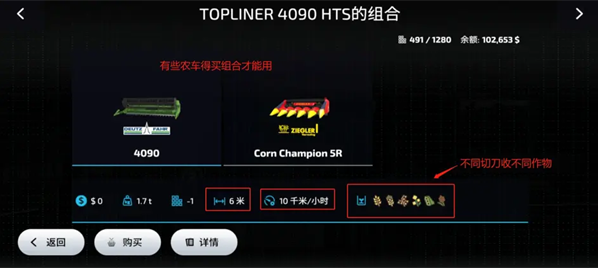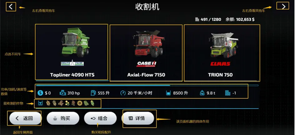 然后随便点一个车,如“收割机”,就能在界面看到这些车的基础信息,具体如图,
