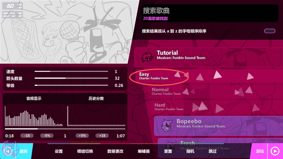 2、选第一首歌练习,难度调到Easy,然后点击游玩;