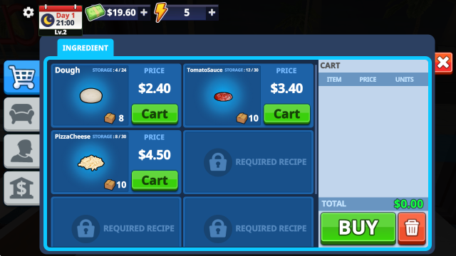 1、进入游戏后,首要任务就是通过电脑下单制作披萨所需的原材料。