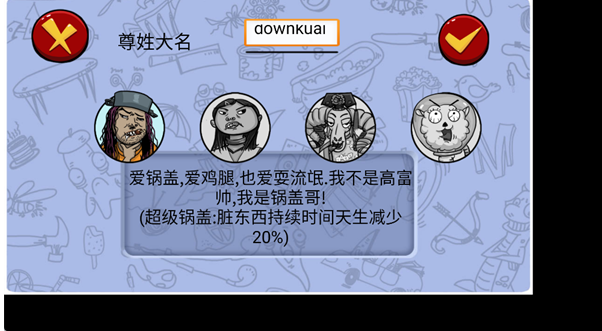 输入你的「尊姓大名」。选择角色:不同角色有专属被动技能,比如「锅盖哥」可以让脏东西持续时间天生减少 20%,根据喜好选择即可。点击右上角对勾确认,完成角色创建。