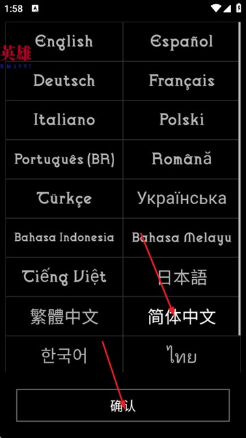 1、首先选择简体中文,点击确认进入游戏;