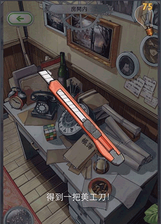 2、 进入桌面,点击笔筒得到美工刀,桌子的第一个抽屉是什么都没有的,点击左下角的道具栏,选择美工刀,点击墙上SAVE ME的画,用美工刀割过去,得到双子座硬币: