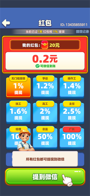 5、红包提现可以通过闯关来提高比例,最高可以100%提现。