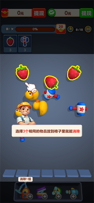 2、登录后就可以开始闯关,将三个相同物品放入格子就可以消除。