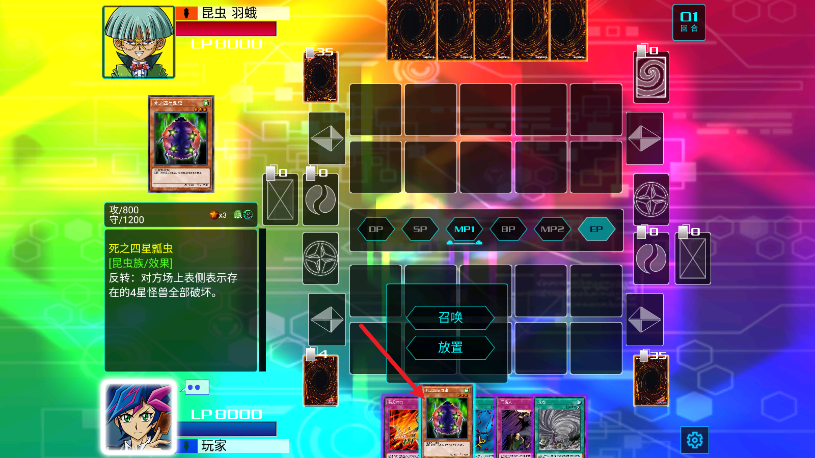 2、卡片分为了怪兽、陷阱和魔法卡,首先看怪兽卡,4星以下怪兽可以直接召唤,这里根据其效果,我们选择盖放召唤。