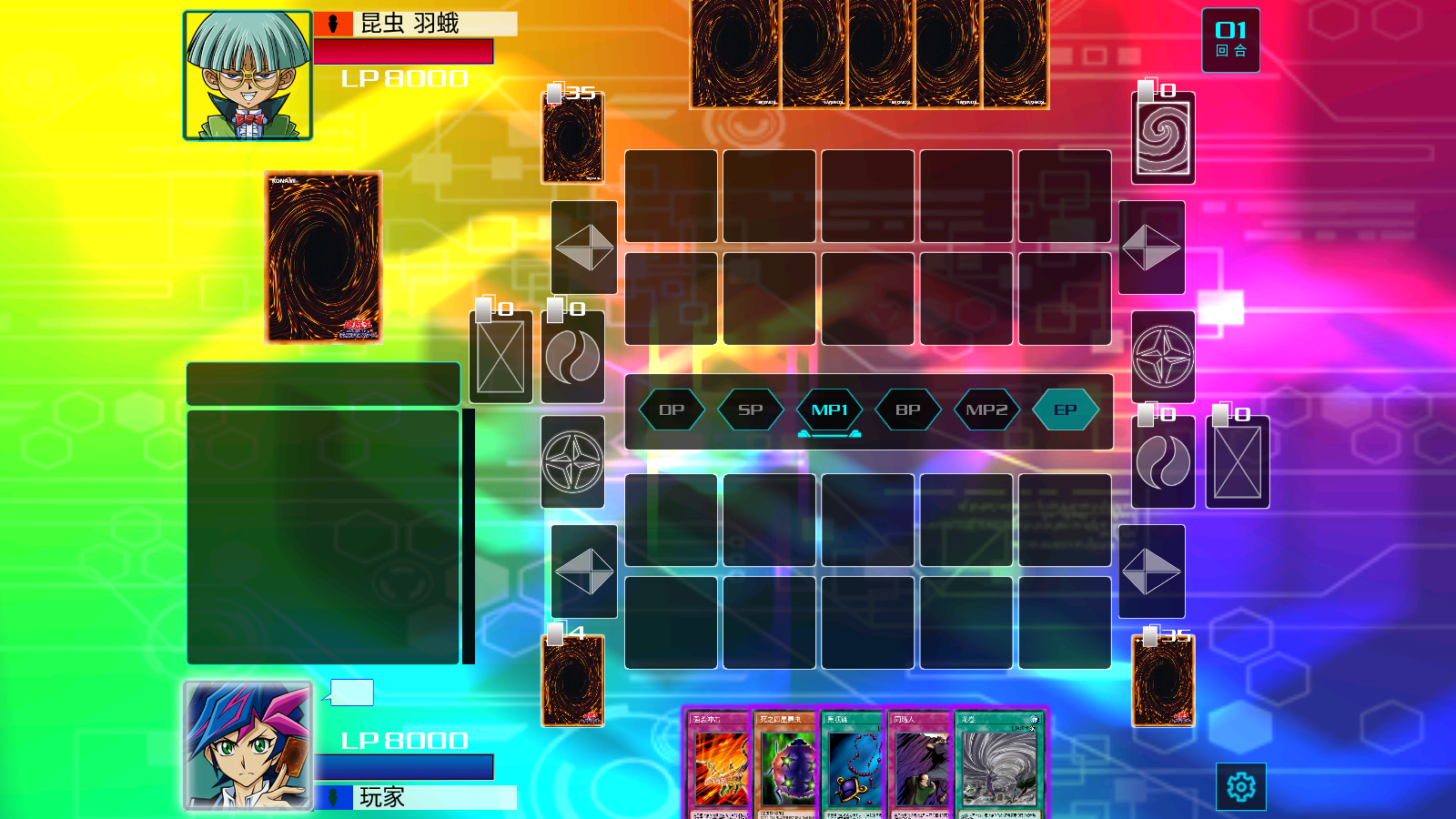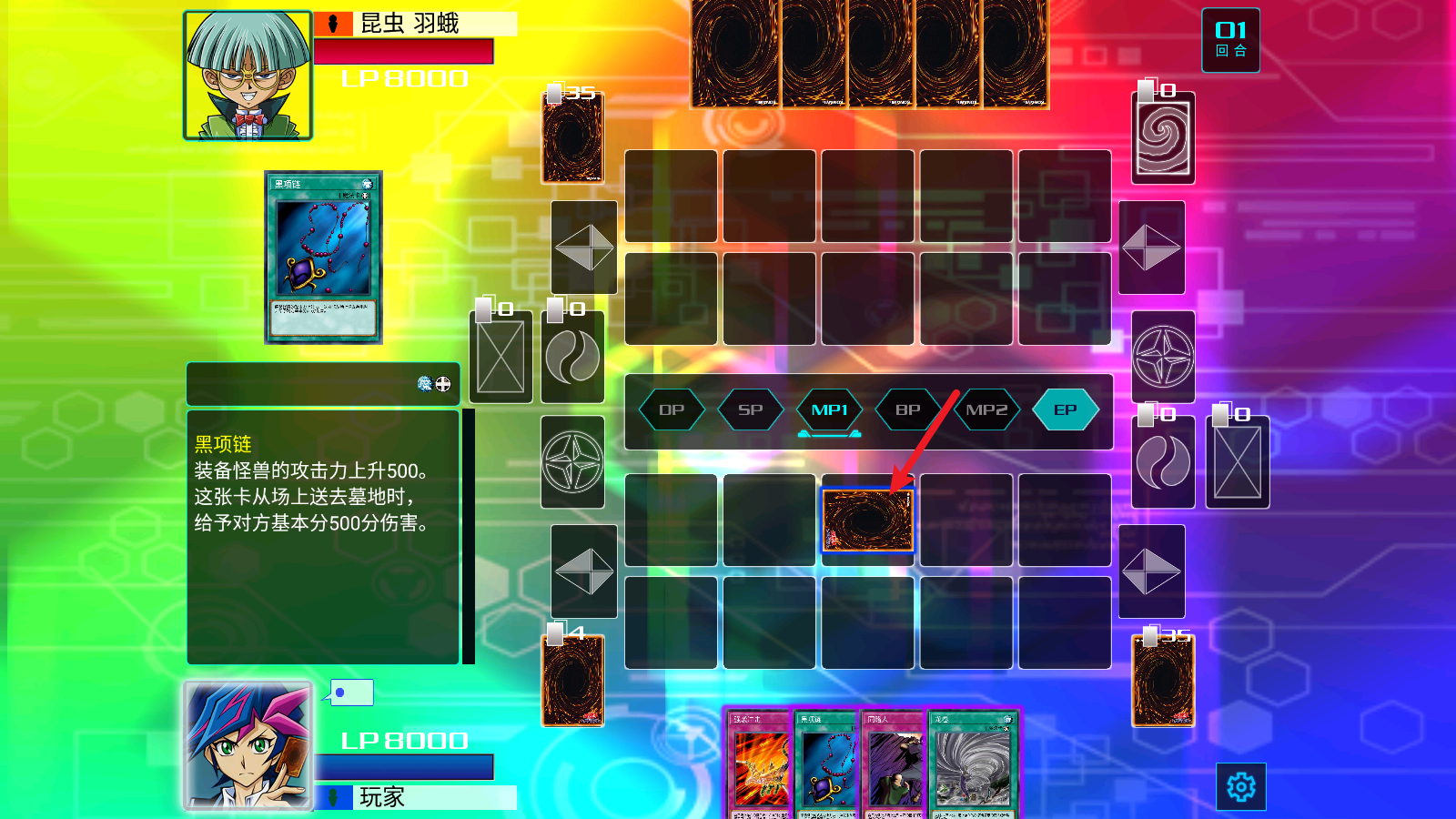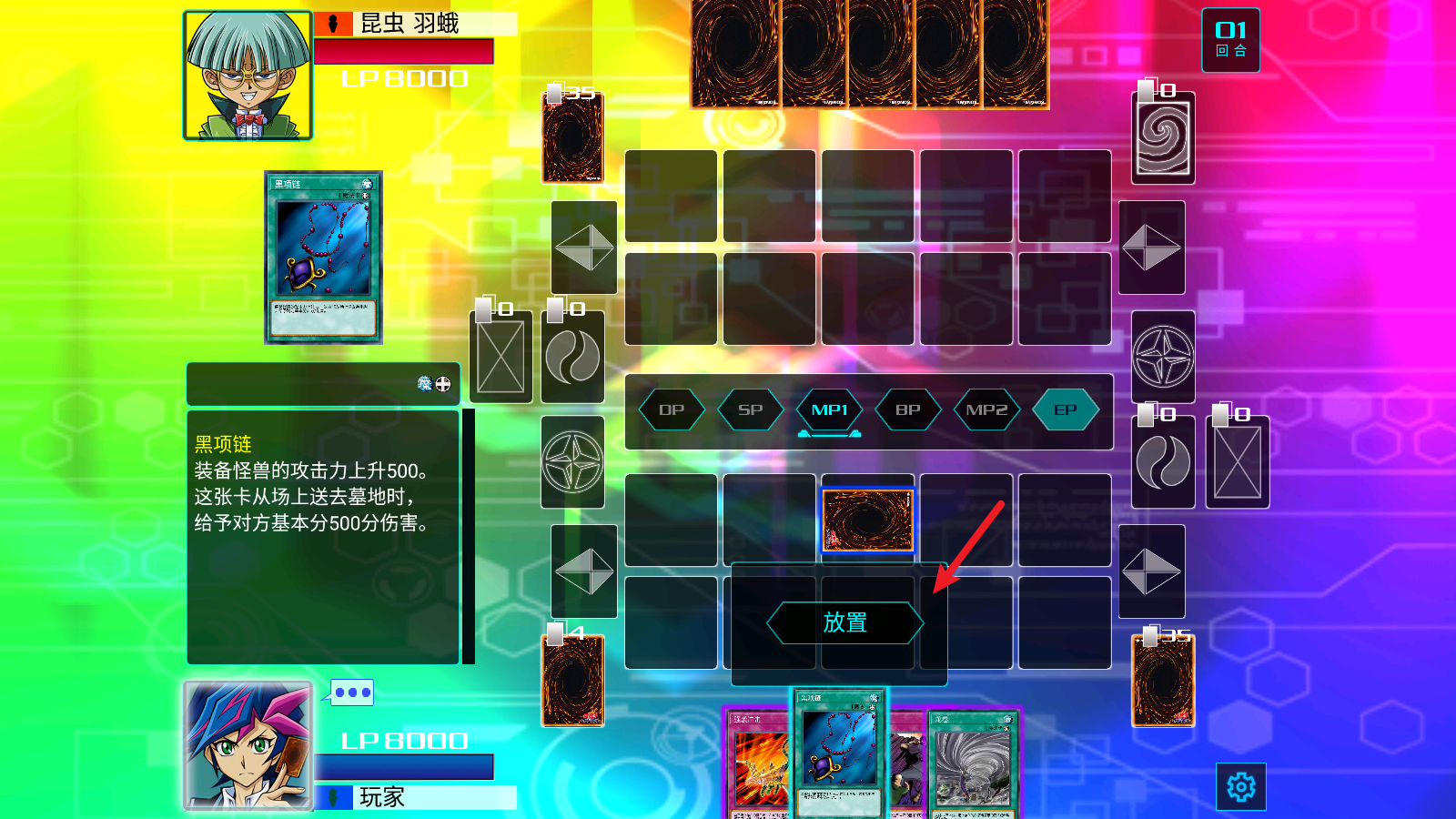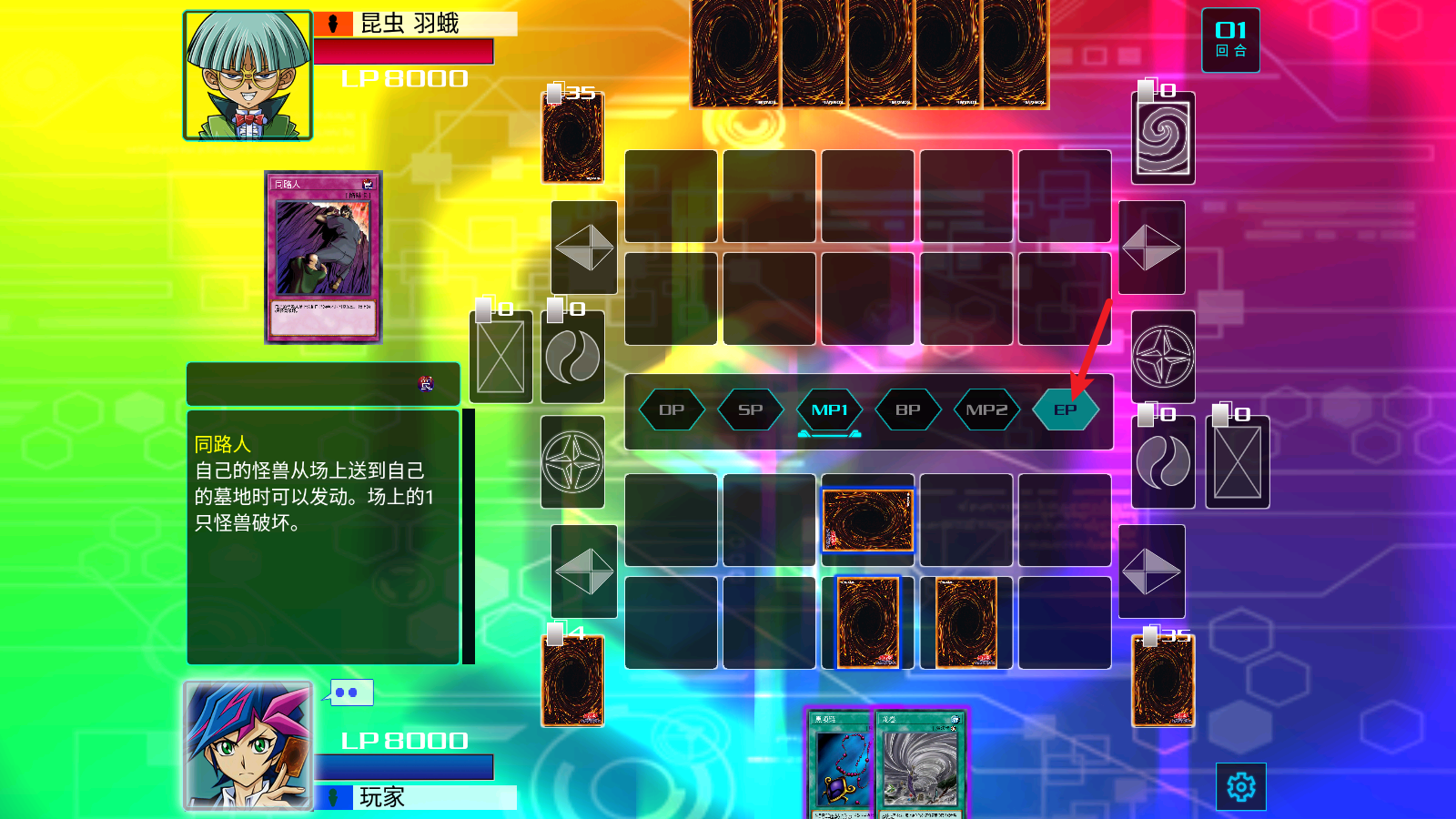 4、陷阱卡需要盖放后才能使用,满足一定条件就能发动了。在没有其他事可以做了之后,就可以选择结束回合,交给对方行动了。