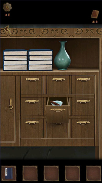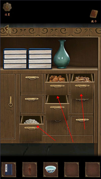 4、点击药柜,打开所有的柜子,在最中间的柜子里获得【火折子】和【空碗】