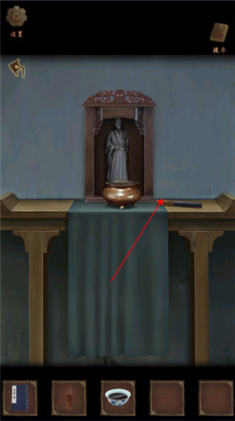 7、点击场景中的贡桌,拾取道具:香,并对着香炉使用该道具将香插上,之后再用火折子点燃香。