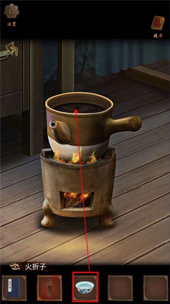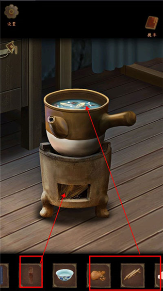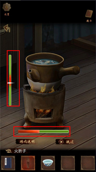 6、点击药罐,放入三个草药,用【火折子】点燃柴火。点击药罐,查看游戏说明,完成小游戏